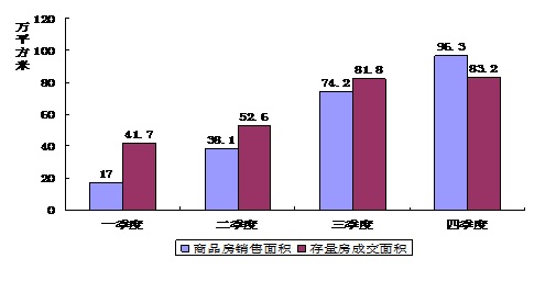 全年完成房地产开发投资239.8亿元,同比下降8.4%。其中,住宅投资157.8亿元,下降21.2%;办公楼和商业营业用房投资51.3亿元,增长52.4%。施工面积1256.7万平方米,增长0.2%,其中,新开工面积228万平方米,下降18%。下半年,房产市场交易活跃,商品房销售量明显回升。全区商品房销售面积225.6万平方米,同比下降7.8%,降幅比上半年收窄51.4个百分点;商品房销售额400.3亿元,同比增长22.4%,比上半年加快43.9个百分点。商品房销售额增长明显快于销售面积的主要原因是去年我区有大量的保障房实现了集中销售,而今年销售的商品房中保障房占比大幅下降,因此虽然总的销售面积仍低于上年,但销售额增长超过两成。