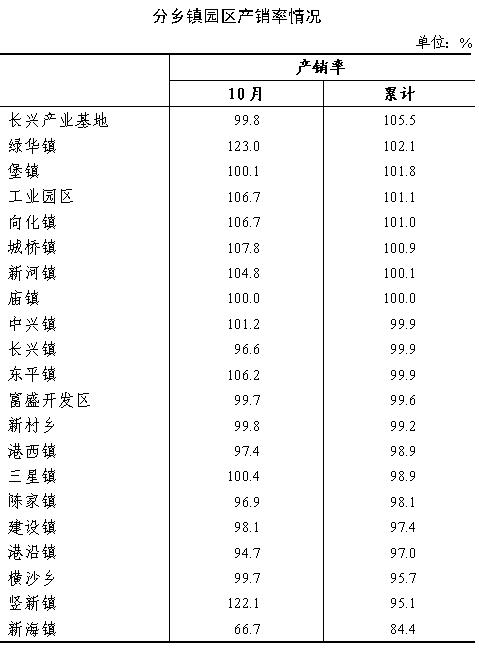 全县21个乡镇园区中,除新海镇外,其余乡镇园区的单月及累计产销率均在95%以上,显示我县工业企业销售渠道通畅,产品基无积压。新海镇产销率水平偏低,主要是由于上海信谊百路达药业有限公司前几月设备检修,10月起检修完成,企业产值快速增长,造成销售进度未赶上生产进度。