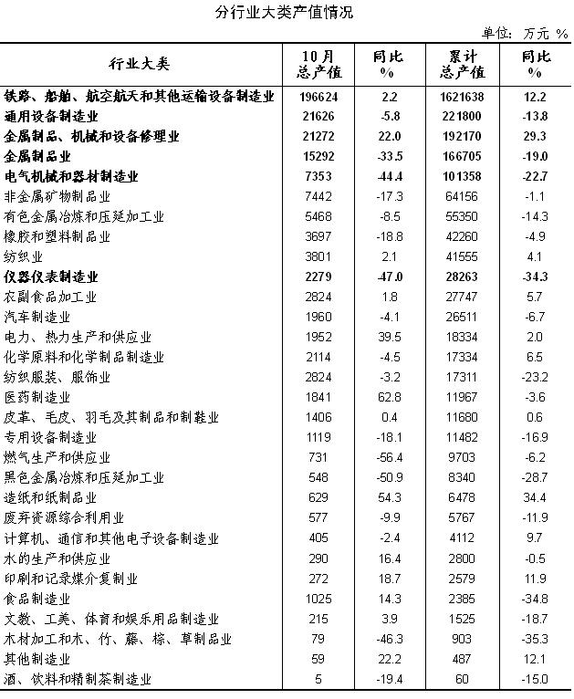 10月份,六大重点行业共计完成总产值26.4亿元,同比下降3.2%。1-10月份,六大重点行业共计完成总产值233.2亿元,同比增长4.5%。