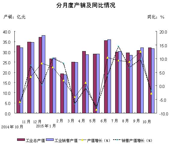 10月份,全县工业完成总产值32.0亿元,环比增长4.6%,同比下降2.8%;完成销售产值31.5亿元,环比下降1.6%,同比下降1.6%。1-10月份,全县工业完成总产值286.7亿元,同比增长2.5%,增幅较1-9月份回落1.1个百分点;完成销售产值285.9亿元,同比增长2.5%,增幅较1-9月份回落1.0个百分点。