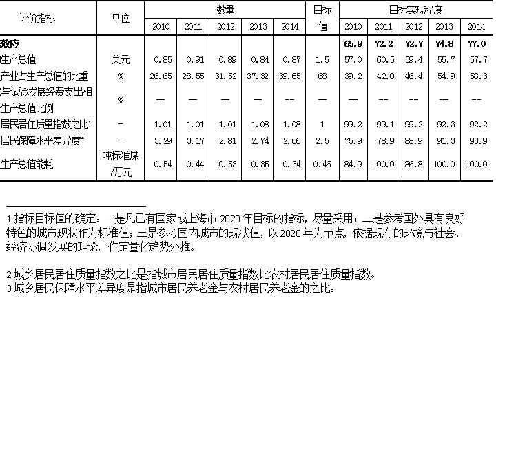 一、生态环境改善对我区社会经济发展产生积极效应生态效应主要反映自然资源保护和生态环境建设所带来的社会经济效应,是实现城乡统筹的基础。共设置6项指标,包括单位能耗、保障水平、民生改善等方面的内容。2014年,我区生态效应目标实现程度为77.0%,比2010年提高11.1个百分点(见表2)。测评结果显示:我区生态经济社会效益同步提高,经济社会与资源环境协调发展,经济结构转型加快。城乡居民生活水平质量不断提高,城乡之间生活保障差异逐步缩小,社会公平正义逐渐彰显 。
