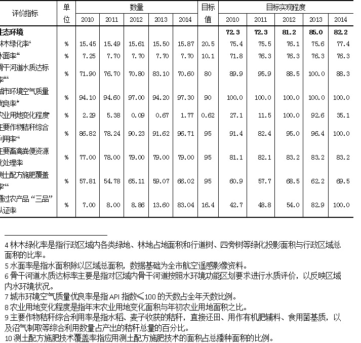 二、生态环境建设稳步推进,目标实现程度连续3年超80%生态环境主要反映自然资源和生态环境的现实状况和利用程度,共设置9项指标,包括绿化、水、空气、农田变化以及生态农业等方面的内容。2014年,我区生态环境目标实现程度为82.2%,比2010年提高9.9个百分点(见表3)。测评结果显示:我区城乡绿化林地建设不断推进,农业生态技术不断提高,农产品生产质量大幅提高。