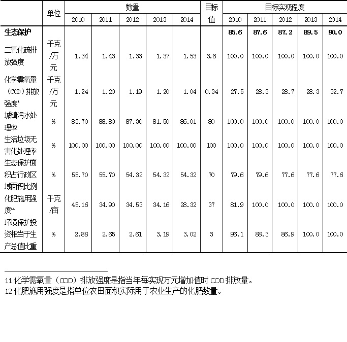三、生态保护各项措施取得实效,目标综合实现程度首次达90%生态保护主要反映对工业排污、化肥施用等方面的治理和控制,积极采纳、推广有效措施所取得的实效。共设置7项指标,包括在城市建设中加大污染治理投入、控制污染物排放、污水及垃圾的处理程度等方面的内容。2014年,我区生态保护目标实现程度为90.0%,比2010年提高4.4个百分点(见表4)。测评结果显示:我区环境污染防治取得成效,主要污染物排放强度处于低位,生活垃圾无害化处理能力领先,化肥施用量逐年减少, 污水处理能力有所提升。