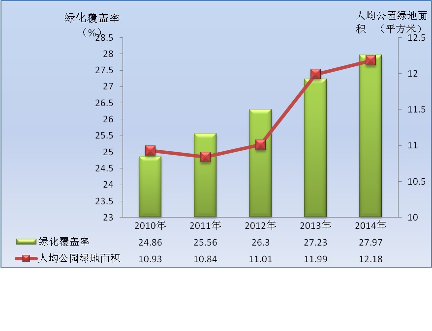 1、绿化建设“以人为本”,人均绿地逐年提高“十二五”以来, 我区在绿化建设中凸显“生态宜居,让绿于民”的理念,2014年末,园林绿地总面积2761.99公顷,比“十一五”末增长12.5%,从图2可以看出,我区建成区绿化覆盖率和人均公园绿地面积逐年提高。至2014年末,建成区绿化覆盖率28.0%,比“十一五”末提高3.1个百分点;人均公园绿地面积从“十一五”末的10.93平方米/人提高到了2014年的12.18平方米/人。