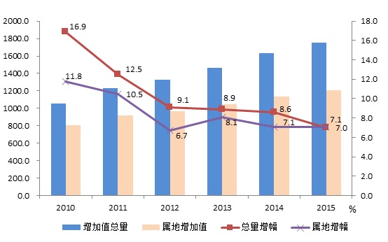 全区经济增速换挡但不失势,共实现增加值1756.1亿元,可比增长7.0%,其中属地增加值1208.6亿元,可比增长7.1%。属地增加值中,第二产业完成705.6亿元,可比增长4.1%,对经济增长的贡献率为35.3%,第三产业完成498.8亿元,可比增长11.7%,对经济增长的贡献率为65.2%,较去年提高27.9个百分点。三次产业结构比重为0.3:58.4:41.3,第三产业占比较去年提高2.1个百分点。