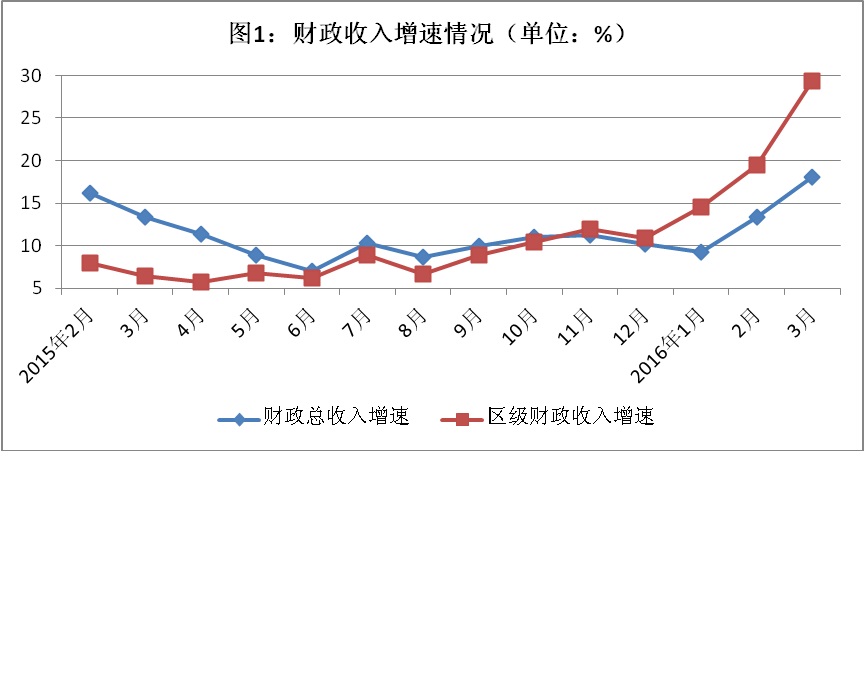 两个财政收入的增速都呈现上扬趋势,区级财政收入增速明显快于财政总收入增速,两者的增速差距扩大到11.2个百分点。究其原因在于区级收入表现突出。其中,中央级收入受去年同期基数较高的影响,同比增长10.5%,较去年同期增幅回落8.5个百分点(注:去年1季度免抵调减增值税为3.7亿元,比上年增长267%,仅此一项大幅拉动去年一季度中央级收入提高9.3个百分点);市级收入增长19.0%,较去年同期增幅提高6.8个百分点;区级税收收入和非税收收入两者均实现不同程度的较快增长,增幅分别为21.9%、223.0%。其中,地方营业税收入受年头楼市升温以及商业服务业迅猛发展的影响,累计实现收入8.6亿元,同比增长19.1%,占区级税收的比重为33%。非税收收入的快速增长是由于农田水利建设以及教育资金收入提早到位的结果。