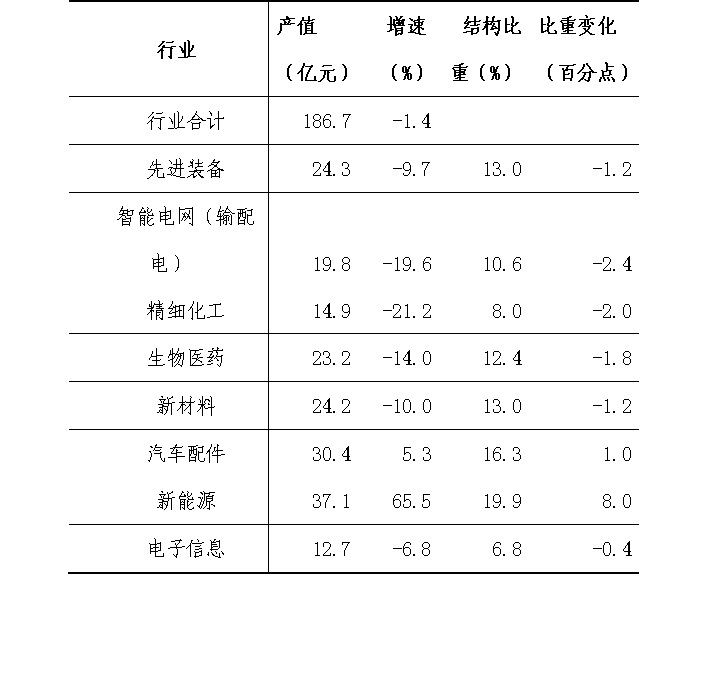 四、需要关注的问题(一)工业下行压力依然存在1、八大重点行业两升五降,短期走势依然低迷从我区重点行业看,行业分化明显。除汽车配件、新能源实现增长外,其他六大行业出现了不同程度的下滑,其中4个行业降幅达到两位数,分别为智能电网、精细化工、生物医药、新材料。