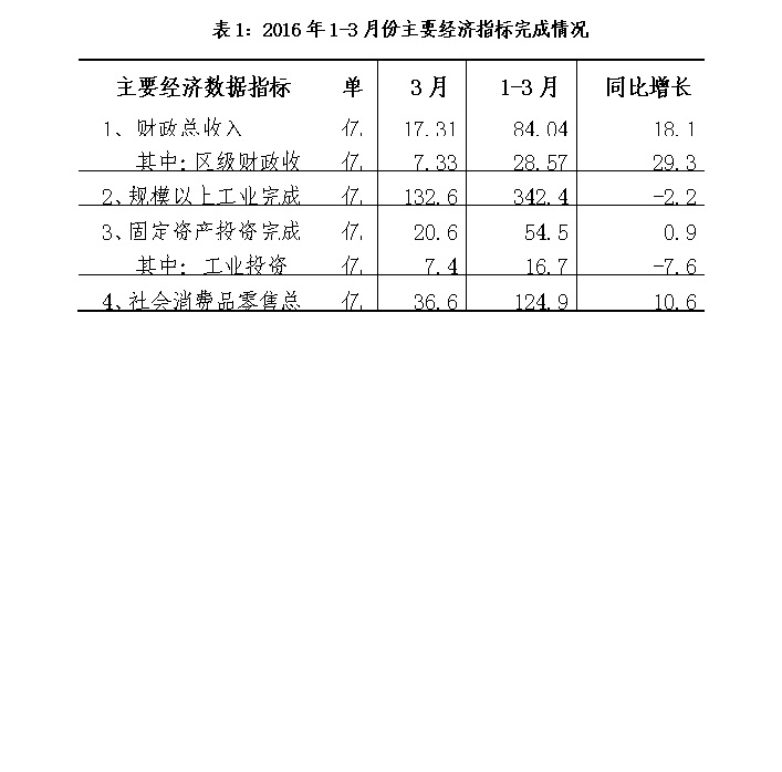 二、我区经济运行稳中趋缓,经济指标好于预期(一)区级财政收入增长较快,开局形势良好1-3月份,我区实现财政总收入84.04亿元,同比增长18.1%,增速比上年提高4.7个百分点;其中,区级财政收入28.57亿元,同比增长29.3%,增幅比上年同期提高22.9个百分点,较去年年底增幅提高18.4个百分点。