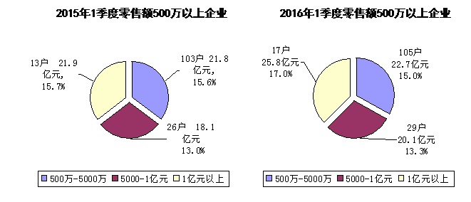 从经营规模看,一季度我区限额以上零售企业中,零售额在500万元以上的共有151家,占全区限额以上零售企业比重为71.9%,比上年同期提高3.3个百分点,实现零售额68.6亿元,比上年同期增长11.0%,占全区零售额45.3%,比上年同期提高1个百分点,其中零售额在500万至5000万元的企业共有105家,实现零售额22.7亿元;5000万至1亿元的企业共有29家,实现零售额20.1亿元;1亿元以上的企业共有17家,比上年同期增加4家,实现零售额25.8亿元,增长17.8%。(如图表所示)
