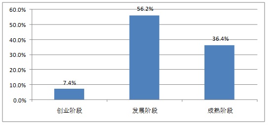 被调查的121家有效样本中,56.2%的企业认为自身处于发展阶段,36.4%的企业认为处于成熟阶段,而7.4%的企业还处于创业阶段。