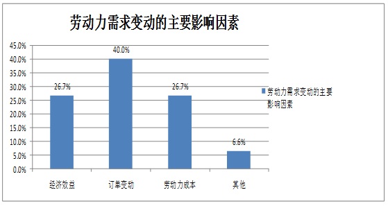 调查结果表明,经济效益、订单变动和劳动力成本是影响企业劳动力需求变动的主要因素。40%的企业认为是订单变动,小微企业受限于自身的发展,缺乏市场核心竞争力,导致订单的下滑。26.7%的企业认为经济效益使得劳动力需求减少,市场需求不足,导致企业难以扩大业务,影响收益,严重制约了企业发展。