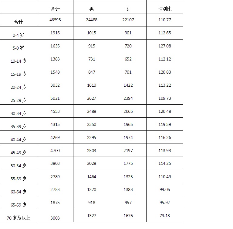 从年龄段看:本区性别比总体呈现两头低中间高的特点,30-54岁年龄段的性别比达到峰值117.16,男女人数差异最大。0-14岁段儿童性别比明显大于15-24岁,说明存在通过判断性别而选择生育的情况。55岁以上的性别比最低为95.09,这主要是由于女性的寿命长于男性所致。(见表2)表2