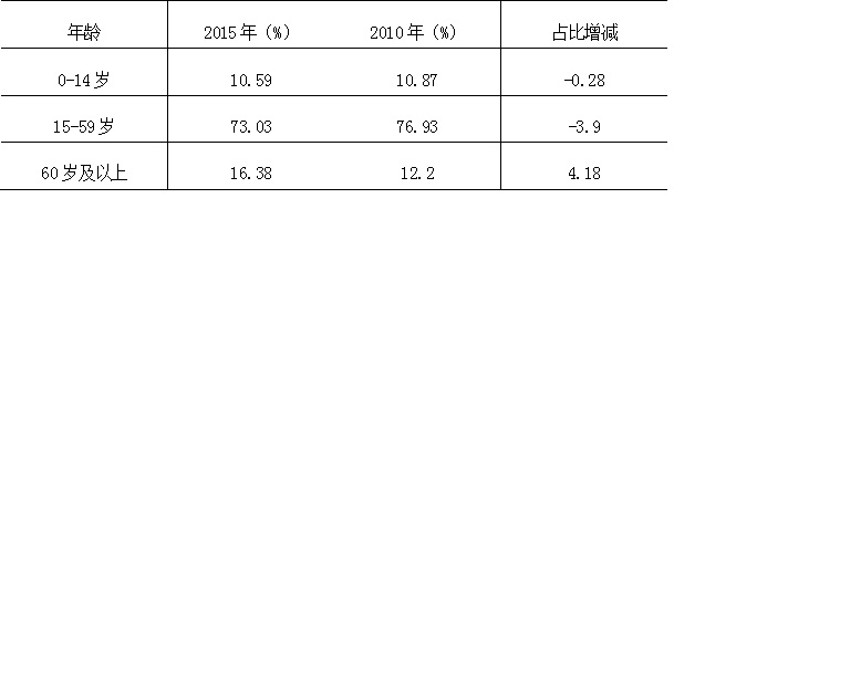 3、年龄结构合理,人口红利继续释放调查常住人口中,0-14岁人口占调查常住人口的10.59%;15-59岁的人口占调查常住人口的73.03%;60岁及以上的人口占调查常住人口的16.38%。同2010年“六普”相比,0-14岁人口的比重下降了0.28个百分点,15-59岁人口比重下降了3.9个百分点,60岁及以上人口比重上升了4.18个百分点。人口年龄结构虽呈现“低中龄段微降高龄段微升”的趋势,但结构分布仍处于“两头低,中间高”合理状态。劳动年龄人口占调查常住人口比73.03%依然可观,明显高于全市劳动年龄人口比重平均水平(71.5%),人口红利继续释放。
