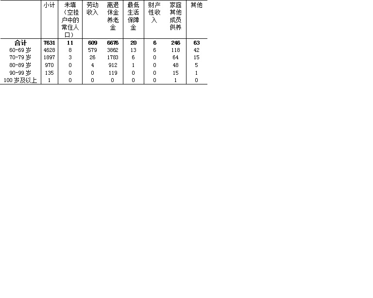 (四)老年人口主要生活来源据奉贤区1%人口抽样调查数据显示(见表4):老年人口主要的生活来源是依靠领取离退休养老金的老年人口有6676人,占调查老年人口总数的87.49%,而 12.51%的老年人口生活来源主要依靠劳动收入、最低生活保障金、财产性收入、家庭其他成员的供养以及其他。