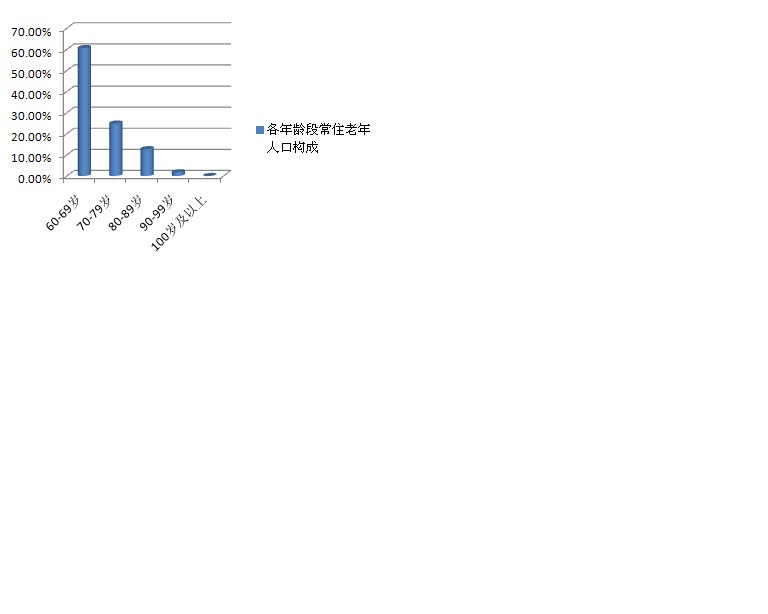 老年人口年龄构成显示,见图1,60-69岁的老年人口占老年人口总量的60.65%;70-79岁的老年人口占比24.86%;80-89岁的老年人口占比12.71%;90-99岁的老年人口占比1.77%;100岁及以上的老年人口占比0.01%。