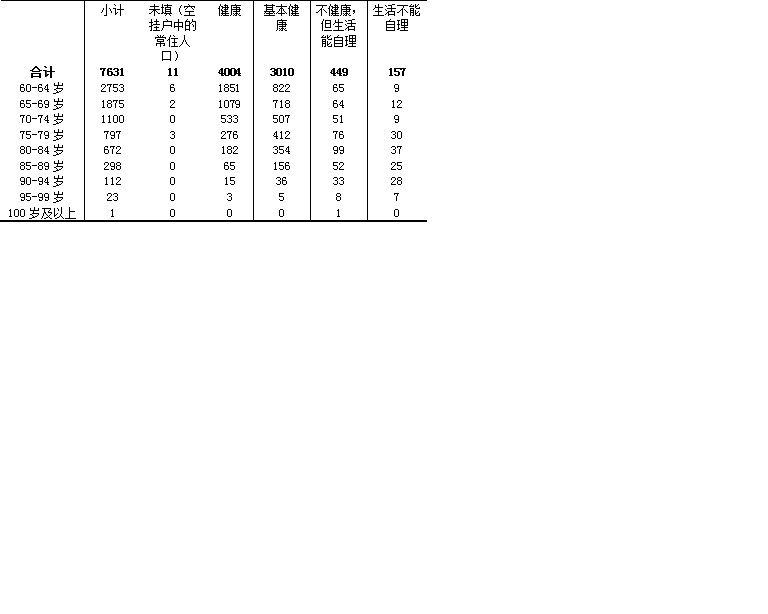 (三)老年人口身体健康状况据奉贤区1%人口抽样调查数据显示(见表3):60岁及以上老年人口身体健康的有4004人,占调查老年人口数的52.47%;基本健康的有3010人,占调查老年人口数的39.44%;不健康,但生活能自理的有449人,占调查老年人口数的5.88%;生活不能自理的有157人,占调查老年人口数的2.06%。