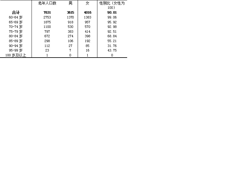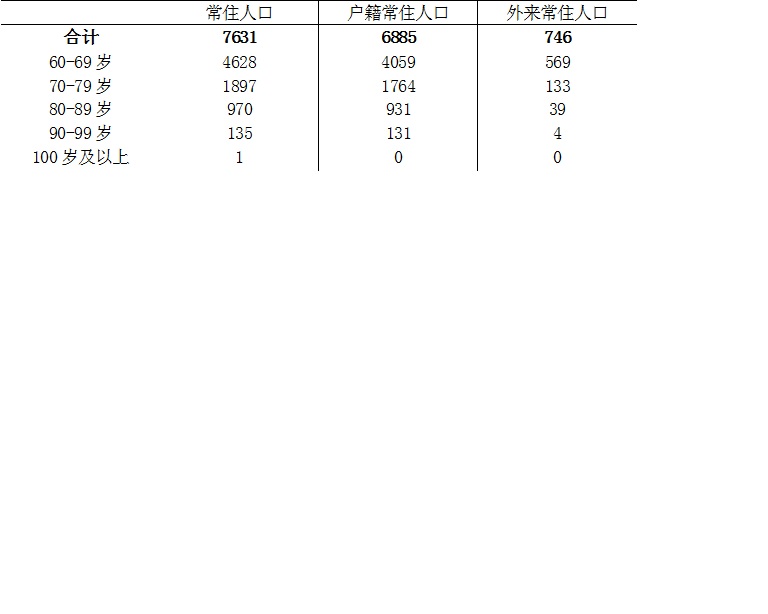 一、老年人口基本状况(一)老年人口总量及年龄构成2015年1%人口抽样调查数据显示:60岁及以上老年人口7631人,其中户籍人口6885人,占90.22%,外来常住人口746人,占9.78%,见表1。