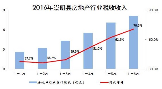 从房地产行业税收看:2016年上半年,房地产行业税收收入实现高增长。上半年累计税收收入达8.1亿元,同比增长70.5%,呈现单边上扬态势。其中,房产税上半年累计收入0.78亿元,同比增长51.8%。说明今年上半年,崇明房地产项目开发建设、楼市交易均比较火热。今年房地产行业全面开始征收增值税后,有利于房地产开发企业收入、利润的增长。