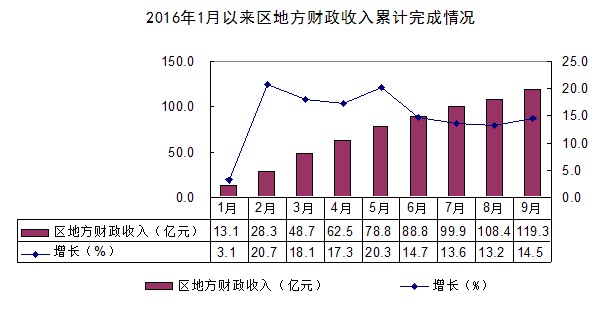 月,全区实现财政总收入289.8亿元,同比增长12.9%。其中,区地方财政收入119.3亿元,增长14.5%,与去年同期相比,加快5.3个百分点。