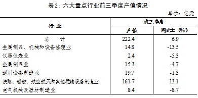 但从具体层面看,六大重点行业增少减多,总体形势不容乐观,需重点关注。其中,仅以船舶制造为主的铁路、船舶、航空航天和其他运输设备制造业实现同比增长13.1%,其余行业均受订单减少、产品价格下降等因素影响,面临不同程度的增速下降。金属制品、机械和设备修理业同比下降13.5%;电气机械和器材制造业同比下降8.7%;仪器仪表业同比下降5.3%;金属制品业同比下降4.7%;通用设备制造业同比下降1.3%。