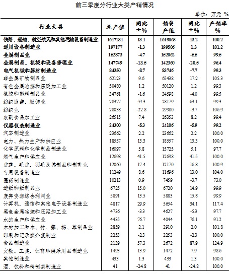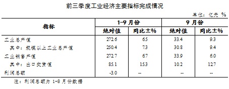 1-9月份,全县工业完成总产值272.6亿元,同比增长6.5%;完成销售产值272.7亿元,同比增长6.7%;累计产销率为100.0%。