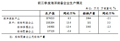 1-9月份,全县海洋装备企业累计完成总产值187.4亿元,同比增长9.3%,增幅较全县水平高2.8个百分点;完成船舶产量3644万载重吨,同比下降2.1%。