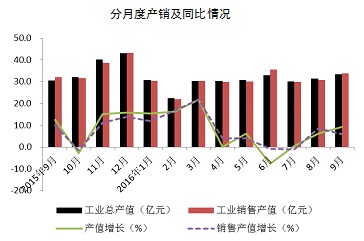 9月份,全县工业完成总产值33.4亿元,同比增长9.3%;完成销售产值33.9亿元,同比增长6.0%;单月产销率为101.6%。