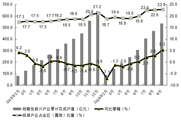 1-9月,我区战略性新兴产业累计完成产值537.0亿元,可比增长5.3%,总量占属地比重22.8%,从量到速都是今年以来的最大值,为缓解规模工业下行压力添了一把“火”。其中,新能源汽车、新能源以及生物医药三大行业在经济下行期仍保持两位数的高增长,可比增长分别为42.2%、41.4%和16.6%。最值得一提的新能源汽车行业,在“狠心”(处罚骗补车企)和“暖心”(帮助车主建充电桩的双重政策刺激下,从年初两位数的可比负增长重新回归到两位数的可比正增长,随着政策的深化和细化,预计将对新能源车今后的发展产生一定的推动力。另外,占比最高的新一代信息技术行业完成产值196.8亿元,可比增长9.4%。