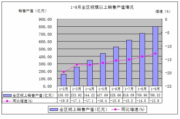 从规上工业销售产值各月累计增幅的情况看,呈现逐月收窄态势,产值增速从年初下降19.8%到1-9月下降12.9%,降幅比1-2月收窄6.9个百分点。