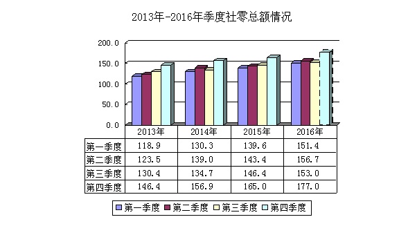 从社零总额的季度数据看,2013-2015年前三季度平均值为分别为124.3亿元、134.7亿元和143.1亿元,今年前三季度社会消费品零售总额的平均值为153.7亿元。前三年四季度比前三季度的平均增长在15.3%-17.8%之间。若按此增速测算,2016年的第四季度零售额在177-181亿元左右,由此推断全区社会消费品零售总额在638-642亿元之间。因此,要实现全区社会消费品零售总额8%的目标,还有待于商业主管部门营造消费环境,挖潜促销,有待于增强居民的消费信心。