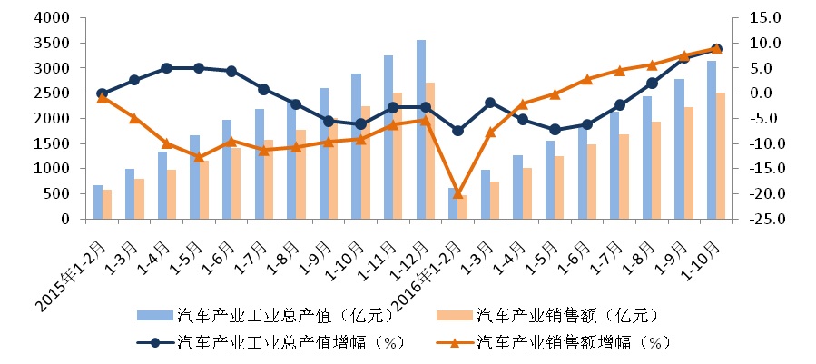 汽车市场趋于回暖,生产销售同步增长。1-10月,全区汽车产业实现产值3145.7亿元,同比增长8.8%,增幅较去年同期提高14.9个百分点。其中,汽车零部件行业产值1518.6亿元,同比增长13.1%。1-10月,全区实现汽车产业销售额2513.4亿元,同比增长9.0%,增幅较去年同期提高18.1个百分点。