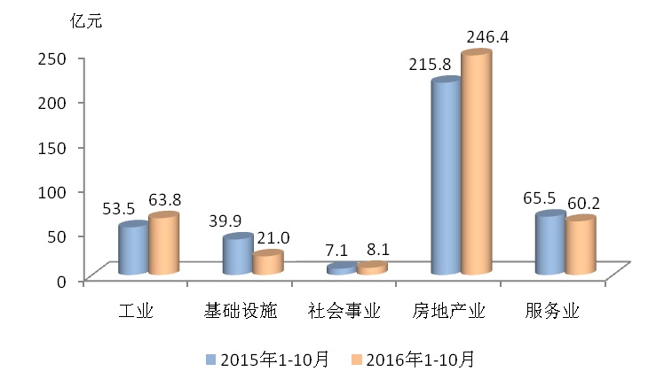 从主要投资领域看,工业完成投资63.8亿元,同比增长19.1%;社会事业完成投资8.1亿元,同比增长14.0%;房地产业完成投资246.4亿元,同比增长14.2%。基础设施与服务业继续下降,分别完成投资21.0亿元和60.2亿元,同比下降47.2%和8.1%。