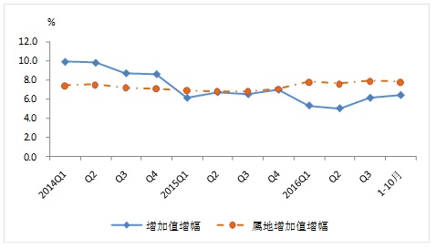 嘉定区统计局 2016-11-17全区经济稳健运行,第三产业保持较快增长。1-10月,全区实现增加值1566.6亿元,可比增长6.4%。其中,属地实现增加值1087.4亿元,可比增长7.8%。从属地经济产业结构来看,第二产业实现增加值602.9亿元,可比增长4.9%,其中工业实现增加值566.4亿元,可比增长4.5%;第三产业实现增加值481.6亿元,可比增长12.1%,其中批发和零售业实现增加值132.9亿元,可比增长12.5%,房地产业实现增加值71.6亿元,可比增长19.4%;第三产业增速高于第二产业7.2个百分点。三次产业比为0.3:55.4:44.3,第三产业比重较去年同期提高2.9个百分点。