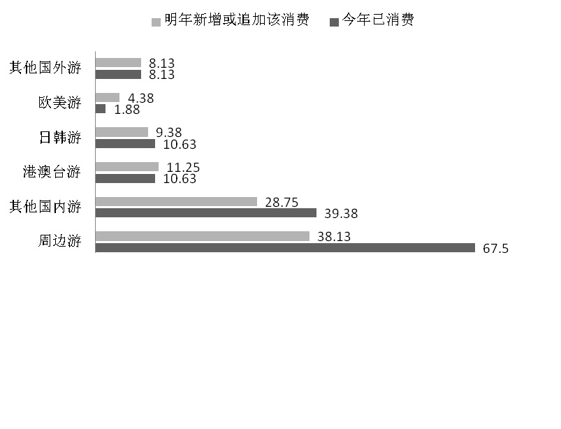 在旅游方面,以周边游居多(67.5%),其次为其他国内游(40.0%)和港澳台游(10.6%)。特别是欧美游,明确表示明年会新增或继续追加消费的人(4.4%)超过今年已消费的人(1.9%),同样,对于日韩游、港澳台游及其他国外游,两组数据变化不大。可见,人们对境外旅游的兴趣逐渐提升(见图4)。