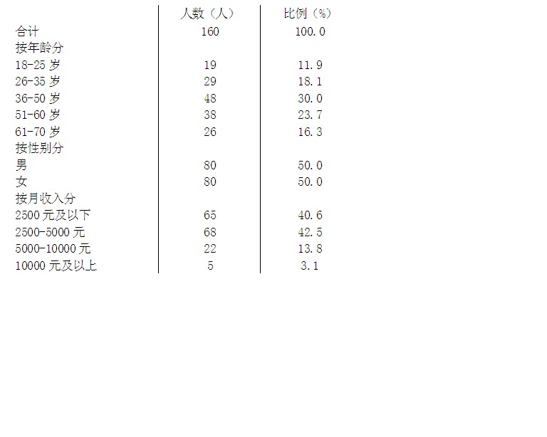 一、调查对象基本情况此次调查样本总量为160个,调查对象以青中年人群居多,其中26岁-50岁人群占比近一半,受访人员的男女比例非常平衡,为1:1。同时,参与调查者的职业分布较为广泛,整体较为合理,其月均收入主要集中在5000元及以下。调查对象的基本情况如下(见表1):