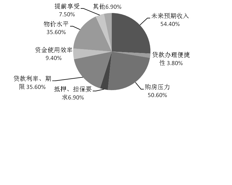 2、贷款消费较少,影响因素较多除房贷、信用卡的消费外,有贷款消费的人群不多(13.1%),主要为50岁以下,月均收入低于1万元的中青年,两者占比都高达九成。调查显示,贷款消费主要用于汽车方面(62.0%)。同时,影响居民是否进行贷款消费的原因也是多样的,未来预期的收入(54.4%),购房压力的大小(50.6%),以及贷款利率、期限(35.6%)和物价水平的变化(35.6%)都会影响到调查对象对贷款消费的选择(见图1)。