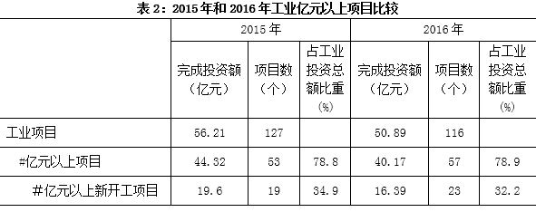 2016年,全区工业在建项目116个,比上年减少11个。其中亿元以上项目57个,完成投资40.17亿元,同比下降9.4%;亿元以上新开工项目23个,完成投资16.39亿元,同比下降16.4%(见表2)。可见,若继续缺乏重大项目建设的拉动,工业投资疲软之势将难以改善。