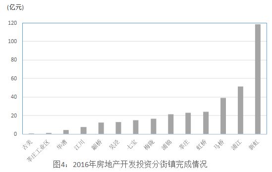 从全区分街镇投资完成情况看,新虹街道和浦江镇位列第一和第二,分别完成118.47亿元和51.29亿元,两镇合计投资额占全区房地产开发投资总量近半。由于虹桥商务区投资的拉动,新虹街道以办公楼和商业营业用房投资为主,完成投资106亿元,占其房地产开发投资的89.5%;浦江镇以住宅投资为主,完成投资35.02亿元,占其房地产开发投资的68.3%。(见图4)