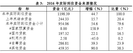 2016年,全区全社会固定资产投资实际到位资金198.39亿元,同比增长44.7%。本年筹集资金中除利用外资有所下降,其他资金来源均有一定增长。资金来源中所占比重较大的是其他资金、自筹资金、国内贷款,本年到位资金共943.48亿元,占全部实际到位资金的78.7%。(见表3)