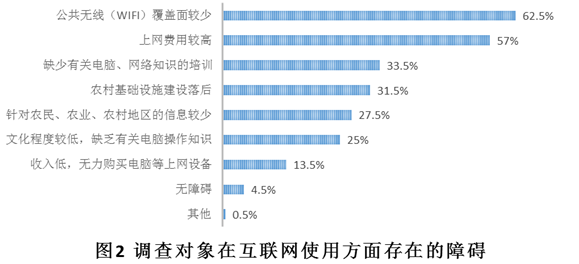 仅有4.5%的调查对象认为目前互联网使用方面没有障碍;有62.5%的调查对象认为“公共无线(WIFI)覆盖面较少”;57%的调查对象觉得上网费用较高;33.5%的调查对象缺少有关电脑、网络知识的培训(详见图2)。