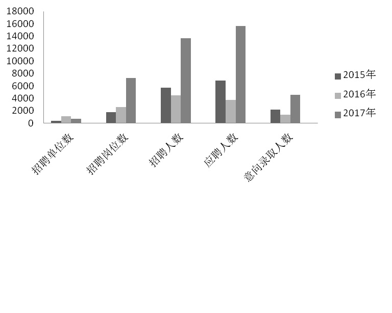 (二)2017年招聘、应聘人数均出现突增情况,就业压力增加通过对奉贤区2015-2017年三年的区级专场招聘会的数据进行对比和分析,2015年区级专场春季招聘会提供的岗位数为1783个,2016年为2568个,2017年为7257个。2015年区级专场春季招聘会的招聘人数为5735人,2016年为4499人,2017年为13650人。2015年区级专场春季招聘会的应聘者人数为6818人,2016年为3733人,2017年为15600人。其中,由于近期关停的企业数量增多,导致失业人数增加。同时,由于前期招聘宣传力度的增强,以及此轮招聘会举办次数的增加,使得今年的招聘人数和应聘人数都出现较大幅度的增长。(见图2)图2 2015-2017年招聘情况
