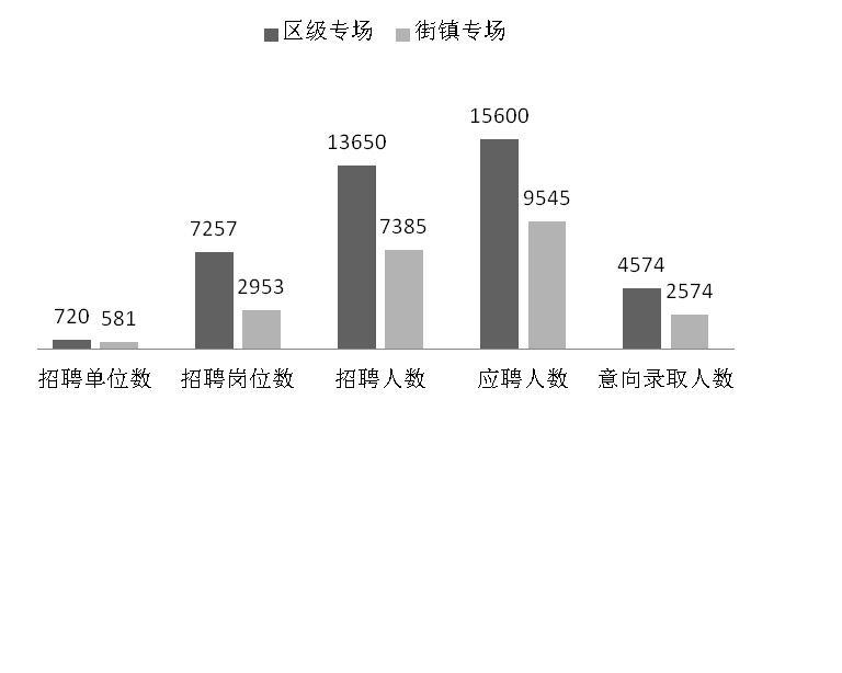 整体来看,参加区级专场招聘的单位数量为720个,占比为55.3%。街镇专场招聘单位数为581个,占比为44.7%。区级专场应聘人数为15600人,占比为62.4%。街镇专场应聘人数为9545人,占比为38.2%。