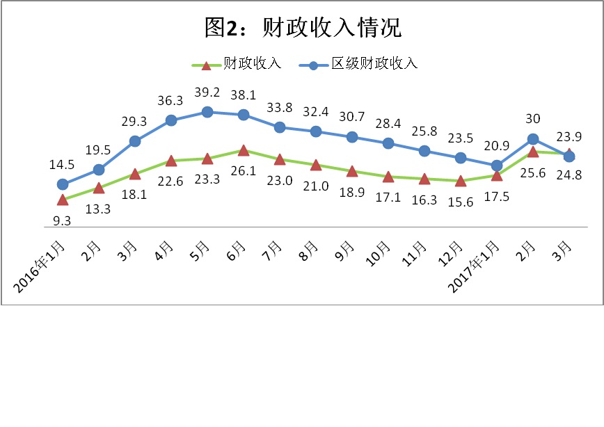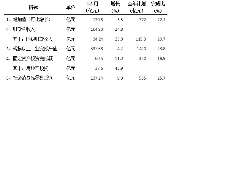 1-3月,全区增加值完成170.8亿元,按可比价格计算,比上年同期增长3.5%;实现财政总收入104.90亿元,增长24.8%,其中:区级财政34.24亿元,增长23.9%;实现规模以上工业总产值337.68亿元,增长4.2%;完成固定资产投资总额60.5亿元,增长11.0%;实现社会消费品零售总额137.24亿元,增长9.9%。