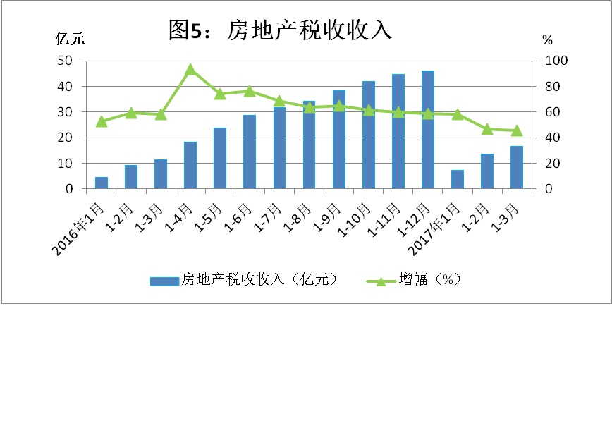 3、房地产税收呈现出增速放缓的趋势。自去年10月开始,房地产税收增速连续6个月下滑。一季度,房地产税收较上年同期回落12.7个百分点,较上年年底回落13.2个百分点。