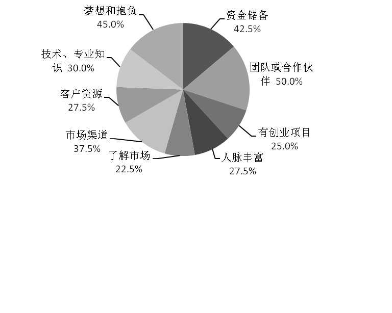 (2)多因素助力创业梦想在有创业计划的人中,促使其点燃创业梦的因素较多,既有创业硬条件(资金储备占比42.5%),又有创业软条件(合作伙伴和团队占比50.0%、技术知识占比30.0%),更有创业的梦想和激情(占比45.0%)。另外,也少不了人脉和市场的助力(市场渠道占比37.5%,人脉资源占比27.5%)(见图2)。