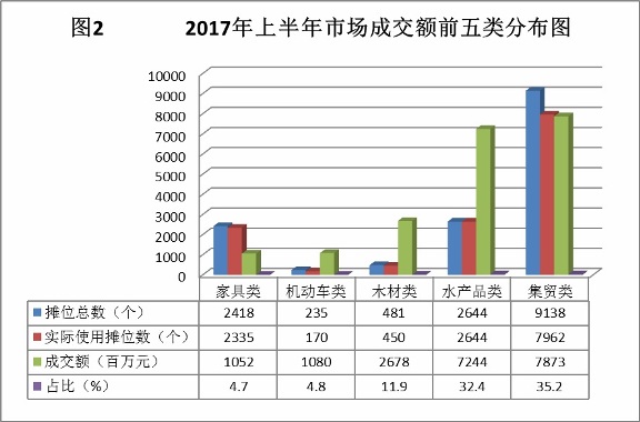 我区1-6月份市场经营的商品种类涵盖了13个大类,其中成交额排名前五类的分别是:集贸类61个市场,实现成交额78.73亿元;水产品市场2个,实现72.44亿元;木材类5个,实现26.78亿元;机动车类4个,实现10.80亿元;家具类4个,实现10.52亿元(如图2所示)。五大市场实现的成交额占总成交额的89.2%。