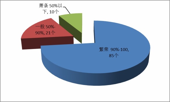 如果以摊位的出租率来划分市场的繁荣程度,超过90%的为繁荣、50%--90%的为一般、50%以下的为萧条,则全区116个市场中,繁荣的有85个,实现成交额184.32亿元,一般的有21个,实现成交额37.28亿元。繁荣的及一般的市场实现的成交额占总成交额的99.2%(见图1)。由此可见我区市场较为繁荣,为当地经济的有序发展带来了活力。