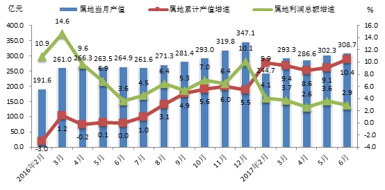 1-6月,属地规上工业完成产值1718.9亿元,同比增长10.4%,高于去年同期10.4个百分点,6月份完成工业总产值308.7亿元,环比增长2.1%;1-6月累计实现利润总额135.1亿元,同比增长2.9%,较一季度回落0.8个百分点,低于去年同期0.7个百分点。