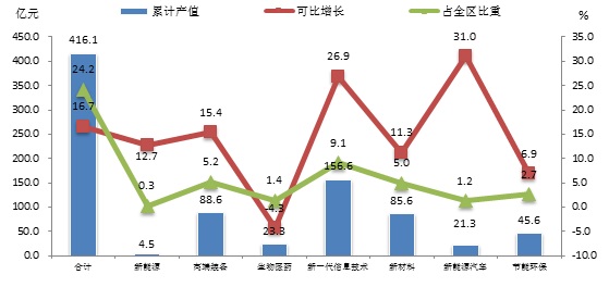 1-6月,战略性新兴产业累计完成产值416.1亿元,可比增长16.7%,占全区属地工业总产值的24.2%,增速及比重分别比一季度提升2.5及1.7个百分点。七大子产业除生物医药产业外,均实现可比增长。其中,新能源、高端装备、新一代信息技术、新材料及新能源汽车产业呈两位数的高增长;节能环保产业摆脱了去年的负增长态势,可比增长6.9%;生物医药产业可比下降4.3%。