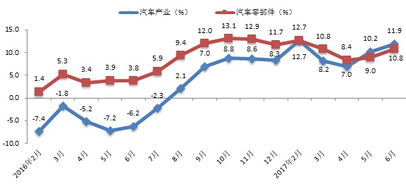 2016年至今汽车产业及汽车零部件业累计增速